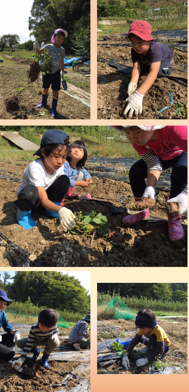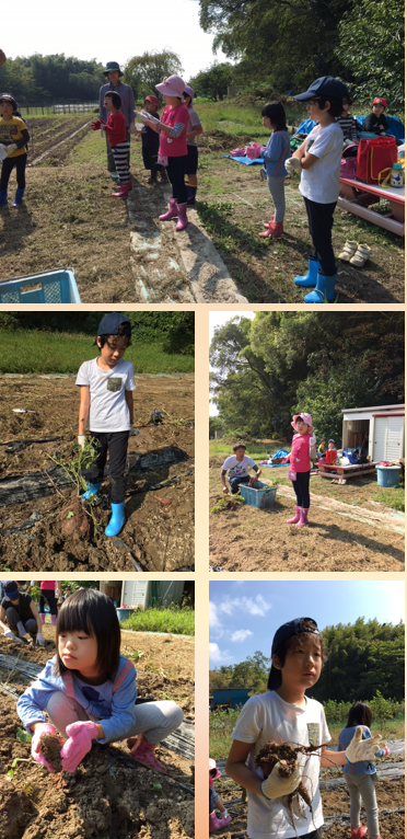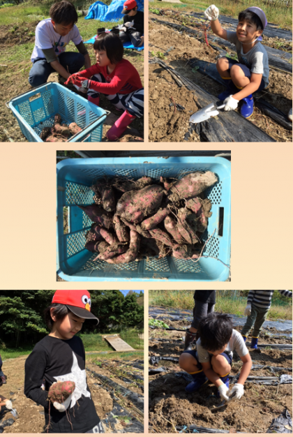 青空の下、元気にさつまいも掘りに行って来ました。大きいさつまいもがゴロゴロ掘れました。みんな汗と土まみれになって頑張りました。