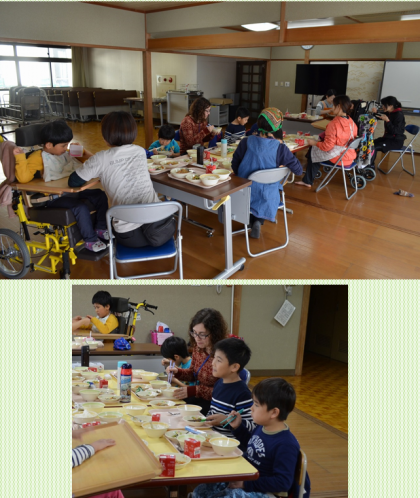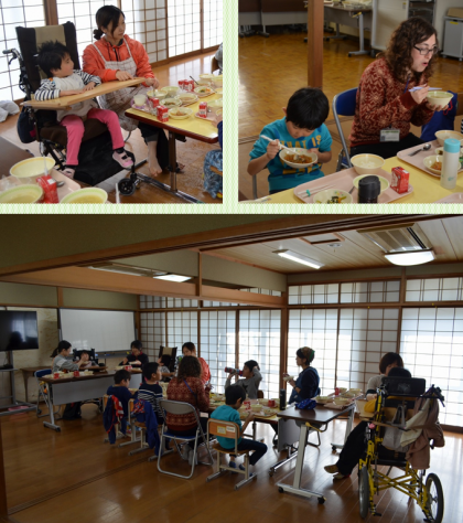 生活学習室で小学部2年生がペンボス先生と一緒に給食を食べました。