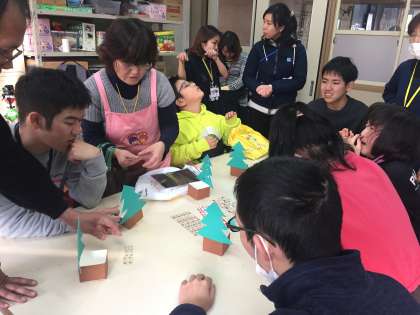 牛乳パックを使ったクリスマスツリーにシールで飾り付けしました。