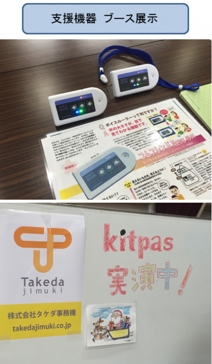 企業のブース展示では,声の大きさが表示される機器や,ガラスに描けてすぐに消せるクレヨン,簡易ベッドや簡易トイレなどの防災グッズ,障害のある方でも簡単に着られるユニバーサル着物など,さまざまな福祉機器や便利グッズが展示されていました。