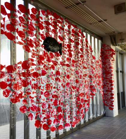 小学部1年生のステージ発表で,大きな歓声の上がったスイミーの背景画が1階の中廊下に展示されました。子ども達一人一人が,真剣に製作した大作です。