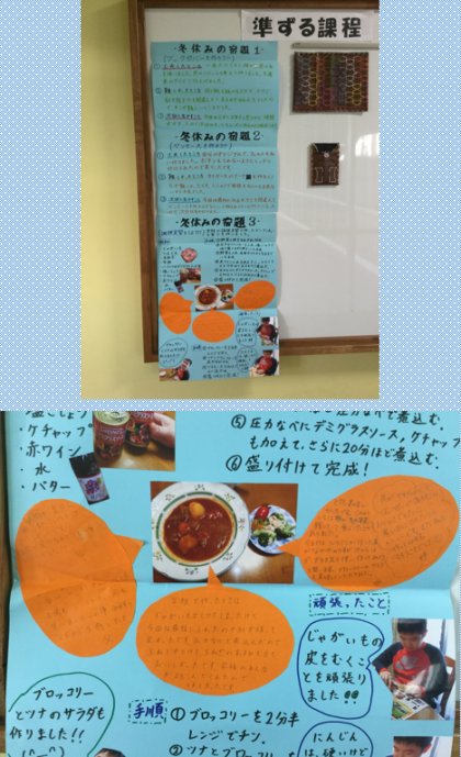 冬休みの宿題は,「小物づくり」(ブックカバー,ペンケース)と「調理実習で作ったメニューを冬休みに作ろう」でした。
