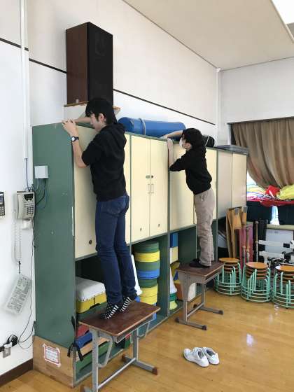 多目的ホールの遊具を整理したり,棚などの拭き掃除やモップ掛けをしました。
