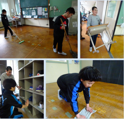 いよいよ明日で今年度が終わります。5年生は1年間、みんなで過ごした教室をきれいに掃除しました。ロッカーの裏から、黒板や全部の窓、下駄箱まできれいに拭きました。一つの節目を大切に、心を込めて掃除しました。