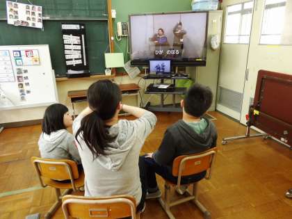 担任の先生から名前を呼ばれて「おへんじ君」と一緒に手を挙げながら返事をしていたり,パンダ君の司会をじっと見ていたり,友達を待っている間に校歌の手話を練習していました。