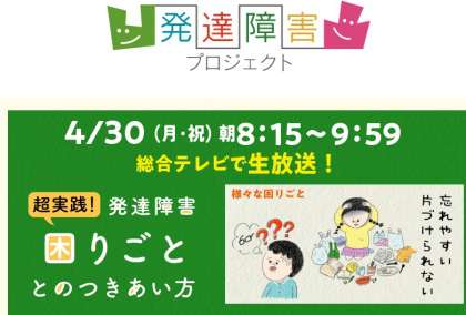 NHKでは,10の番組が連携して「発達障害プロジェクト」がスタートしており,4月30日(月)に「超実践! 発達障害 ”困りごと”とのつきあい方」という番組が放映されます。新年度が始まり不安が多くなるこの時期に,NHKに寄せられた声の中から対処法を厳選し,具体的に伝えていただける番組のようです。