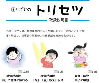 また,「発達障害プロジェクト」のホームページには,「困りごとのトリセツ」も掲載されています。発達障害のある人が感じやすい「困りごと」を整理し,その特性,周りからどのように思われているか,対処法などを体験談を踏まえてわかりやすく説明してあります。