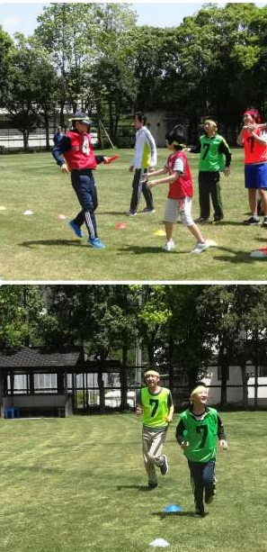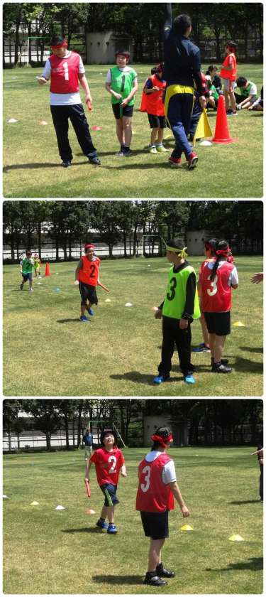 緑の芝生グラウンドで晴れ渡る青空の下,学校祭体育の部のリレー練習をしていました。