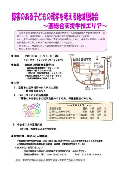6月14日(木)「障害のある子どもの就学を考える地域懇談会」を開催いたします。本校の通学区域内(右京区・西京区・南区の大薮小学校および久世西小学校区)に居住されている障害のある子どもの保護者,ならびに就学前施設の関係職員等が参加対象となっております。