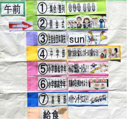 学校祭体育の部で,演技・競技の進行が子ども達にわかりやすいようにプログラム提示を工夫します。終わった演技・競技は見えないようにして,矢印で進行中のものを示します。