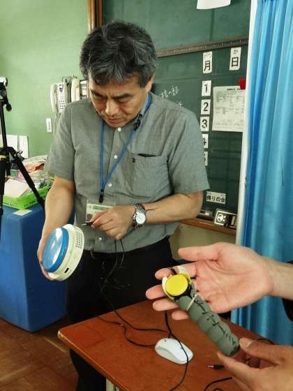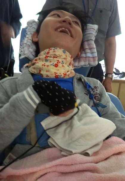 今日は,手元のスイッチを操作してパソコンのスライドめくりに挑戦するため,スイッチの持ち手の部分を工夫したり,角度等の調整の相談に乗っていただきました。