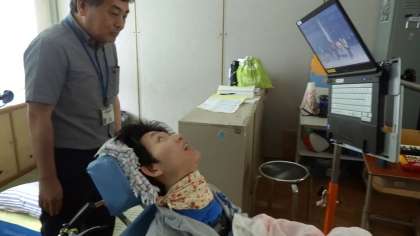 学校祭体育の部の練習風景のスライドが動画付で再生されると,ニコッと笑いながらじっと見つめています。
