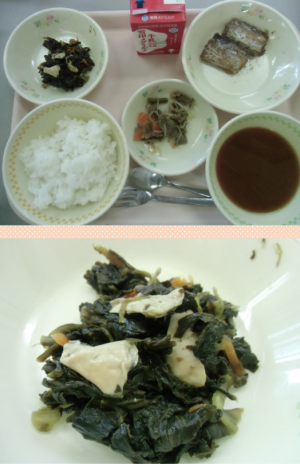 今日の給食では,ほうれん草・にんじん・ゆばを使って煮びたしにしました。