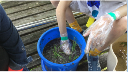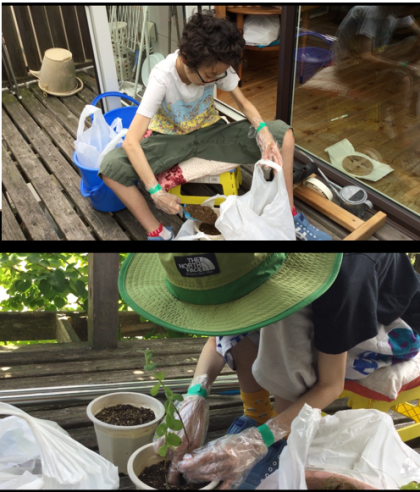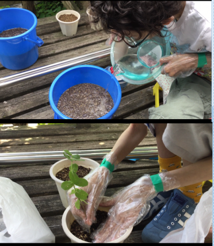 1つは鉢に土を入れミントを植え,もう1つは米は,バケツに土と水を入れ数日寝かせて置き,田植えをしました。