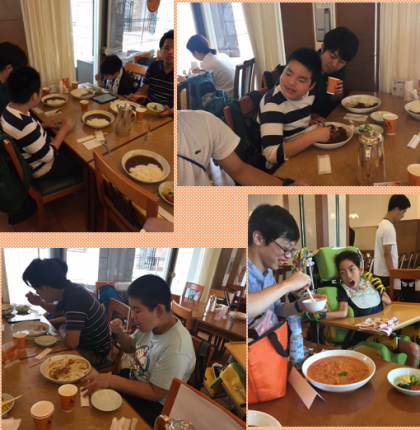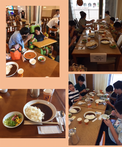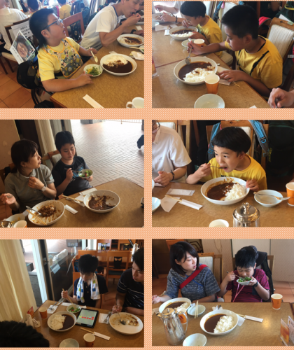 遊園地でたくさん乗り物を楽しみ、待ちに待った昼食です!ホテルのカレーをいただきま〜す!みんな夢中です!
