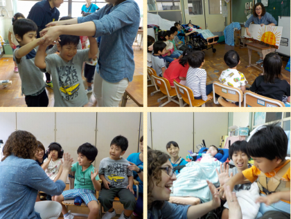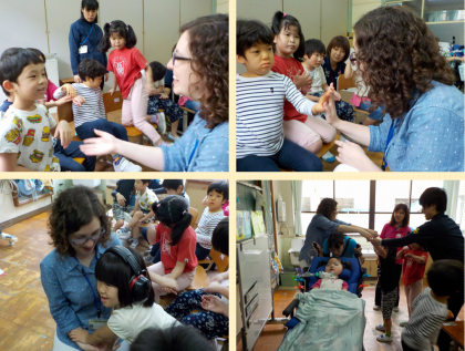 最初は照れていた子どもたちでしたが,手遊びや「ロンドン橋落ちた」のゲームで仲良くなり,笑顔がいっぱい見られました。