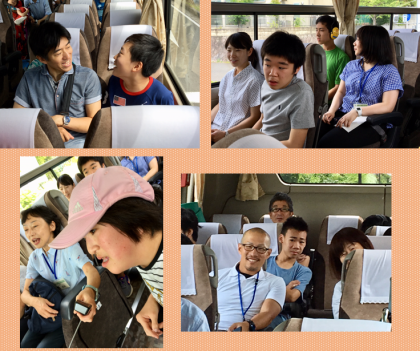バスの中で、早速、レクレーションが始まりました。修学旅行体操の歌をみんなで歌い、○×クイズが始まりました。とても盛り上がっています。
