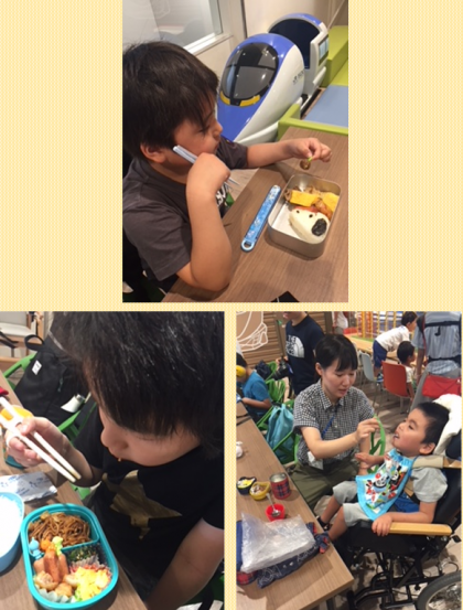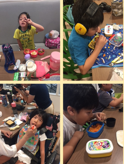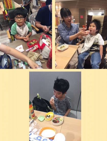 お昼になりました。お父さん、お母さんが作ってくれた手作りお弁当をいただきま〜す!みんなのお弁当美味しそうだね。