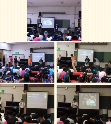 校歌を歌い,校長先生のお話を聞いた後,各学部の代表が夏休みの思い出を発表しました。訪問の児童も通信で発表しました。