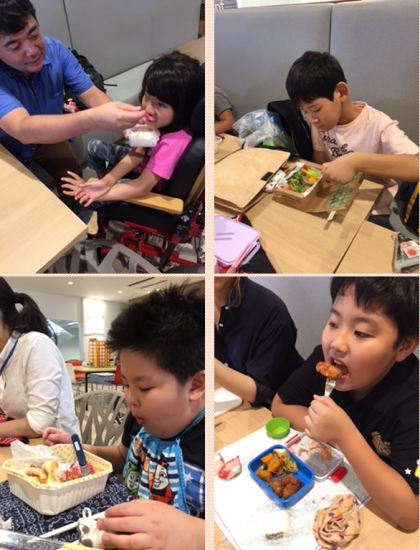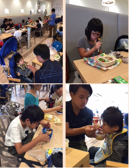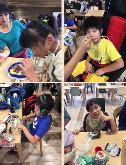 お昼はお父さんやお母さんが作ってくれた、お弁当を食べました!みんな、待ちきれないくらい楽しみにしていました。いただきま〜す!