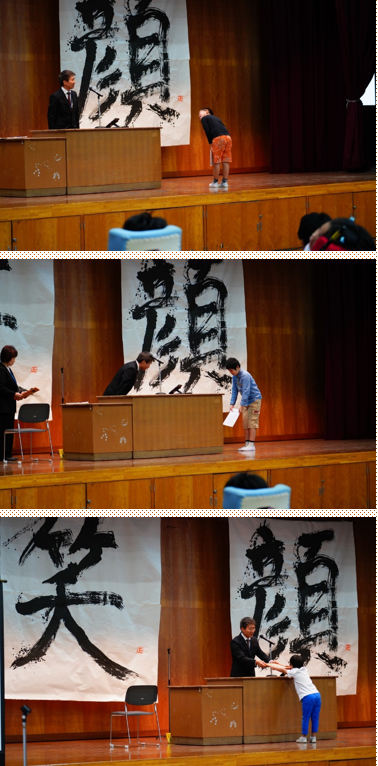 終業式では,校歌を歌った後,校長先生のお話の中で「あ・そ・べ」の「あいさつ」,「そうじ」,「べんきょう」それぞれでみんなががんばっている姿がビデオで紹介されました。