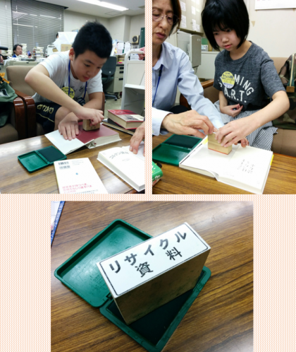 生き方探究チャレンジ体験で,『洛西図書館』で実習をさせていただきました。館内を案内してもらった後、作業をしました。作業は、古くなった本に「リサイクル資料」と書かれたスタンプを押す活動と,市内の図書館同士で本を郵送するカバンについている名札の回収と分別です。一時間集中して取り組みました。実習を終えた感想は『楽しかったので、またやりたいです!』と言ってました。あと二日間頑張ります!