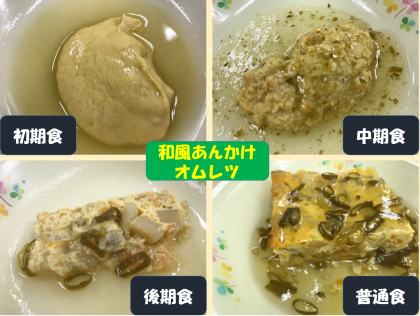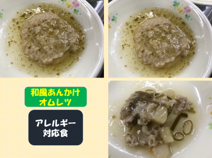 和風あんかけオムレツのアレルギー対応食は,鶏卵や牛乳を除去して,豚のひき肉やジャガイモ,たまねぎを増やして作っています。