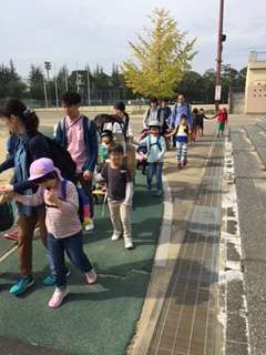 八幡市民スポーツ公園に到着しました!みんな、手を繋いだり、前の人を意識したりして歩いています。