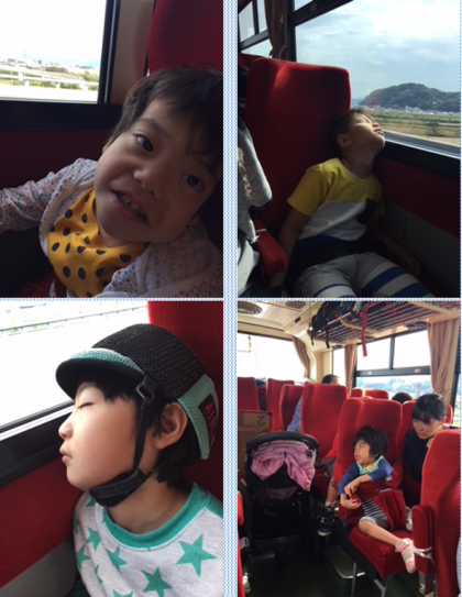 帰りのバスの中は、まだまだ元気な子、疲れて寝てる子がいます。楽しい思い出が作れたね!