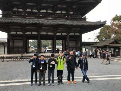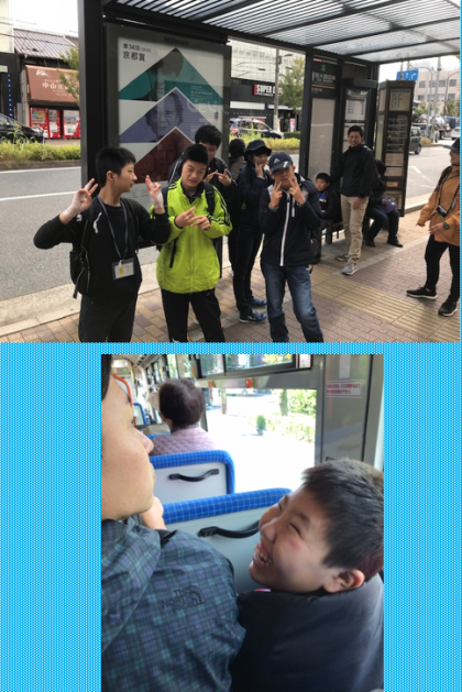 快晴に恵まれ学校を出発し、西大路四条にてバス待ちです。