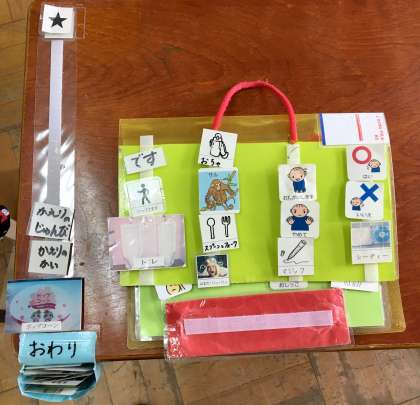 昨年度から,個別スケジュール及び絵や写真カードを使い,指導者側からも視覚支援を使って伝えるようにした。