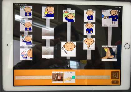 タブレット端末からPECS4+アプリを起動し,少しずつだが挨拶ができつつある。クラスメートの顔は,タブレット端末の写真カードと実際の友達を見比べ,「○○さん おはようございます 元気ですか・・握手」ができるようになってきている。