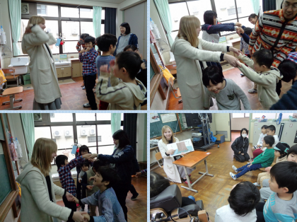 英語で本を読んで「Pig」と発音したり,「Head,Shoulders,Knees and Toes」の歌に合わせて身体を動かしたり,ロンドン橋をしました!