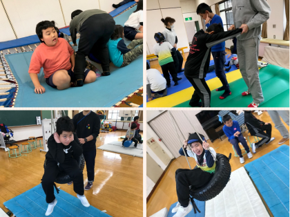 12月11日(火)に,ホールで4年生と6年生合同で”ゆれあそび”をしました。