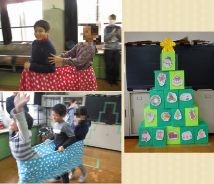 桂坂小学校4年生との交流会をしました。協力してクリスマスツリーを作ったり,