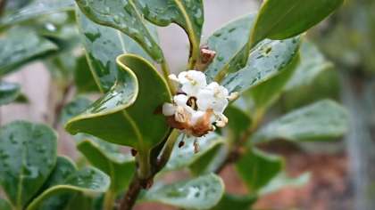6月2日(土)のわくわくクラブ記念植樹の会で,校門を入って左手に植えられた「マルバヒイラギ」の木が白く小さな花を咲かせています。