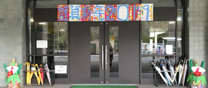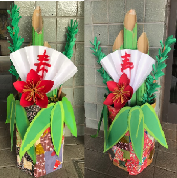 年末に,高等部3年生の生徒が授業で作った門松などで玄関が飾られています。