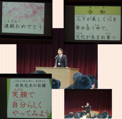 引き続き行われた始業式の校長先生のお話の中では,新しい元号の「令和」のことばの意味のお話や,今年度も「あ(あいさつ)・そ(そうじ)・べ(べんきょう)」に頑張って取り組んでいこうというお話,校長先生の今年度の目標「笑顔で自分らしくやってみよう」のお話があり,最後に春休みの間に練習された,体育の部の団体演技(準備体操)の「USA」を披露されました。