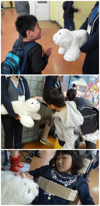 アザラシ型セラピーロボットの「くうちゃん」も,子ども達の登校を出迎えました。