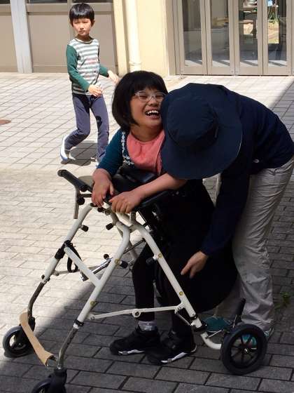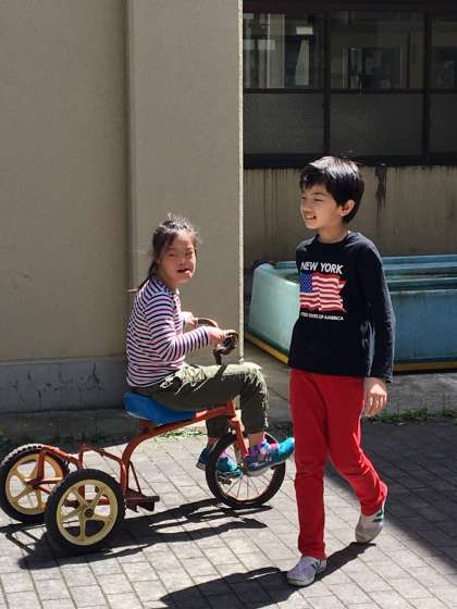 晴れ渡る青空の下,とても気持ちの良い午後,小学部4年生は中庭でそれぞれの楽しみ方で活動していました。サッカーをしている子ども,シャボン玉をしている子ども,乗り物に乗っている子ども,学年の仲間と一緒に楽しんでいます!