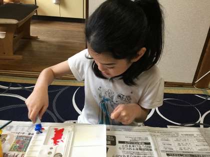 パレットには絵の具を入れる部屋,混ぜる部屋があること,筆洗は色を落とす部屋,きれいに仕上げる部屋があることを知り,赤,青,黄,紫,緑,オレンジの順番に色づくりをしました。紫,緑,オレンジは自分で色を混ぜて作りました。