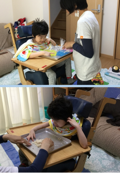 プチプチ,水袋,パン粉を使って感触遊びをしました。