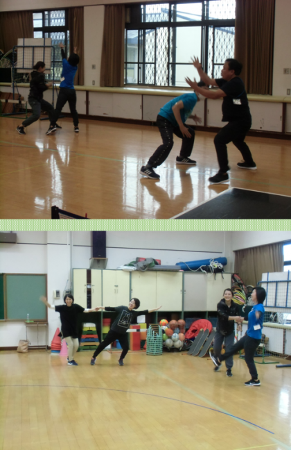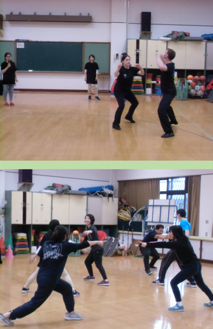 児童生徒と同じように「ドンキホーテ」の登場人物に合わせた動きをしたり,ゲーム形式でいろいろな動きをしたりしました。
