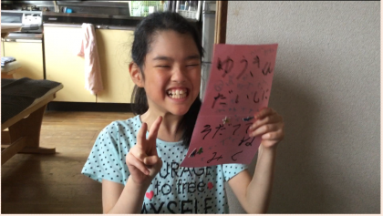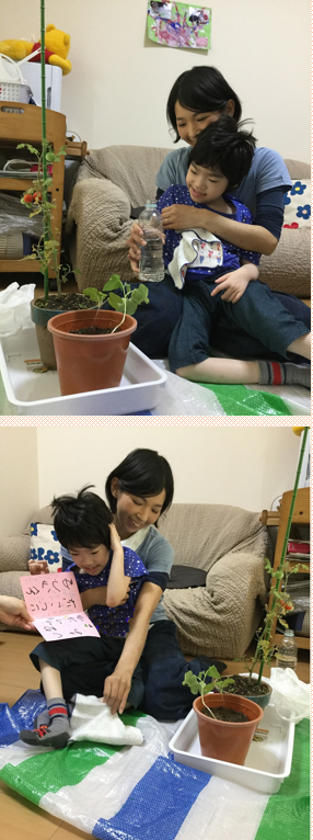5年生の児童が育て始めたあさがおの苗が大きくなってきたので,1鉢を4年生の児童にプレゼントしました。「だいじにそだててね」と書いた手紙も渡しました。