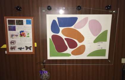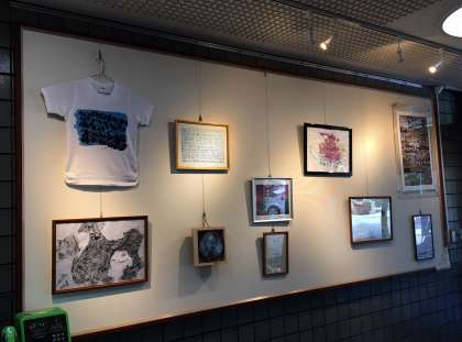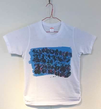 先日,ホームページで紹介しました「東京恵比寿の画廊で開催された展覧会の作品として選ばれた卒業生」の作品がプリントされたTシャツを玄関ギャラリーに展示しました。