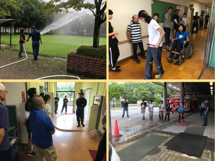 消火器や消火栓を使っての消火訓練,搬送訓練,防火シャッターの開閉説明,消防車の見学を行っていただきました。