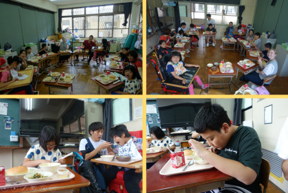 給食を食べました。当初は1クラスでの給食交流でしたが、「一緒に食べたい!」とみんなが集まってきました。結果的には学年全員が集まってにぎやかに食べました。