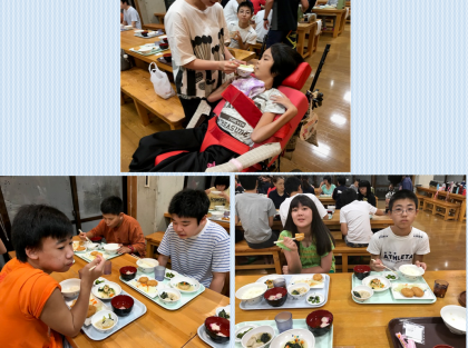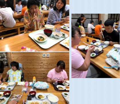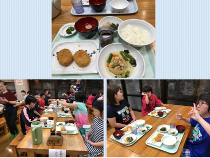 夕食の献立は,コロッケにハンバーグ、餃子、お吸い物、ご飯、お漬物、豪華なメニューです。
