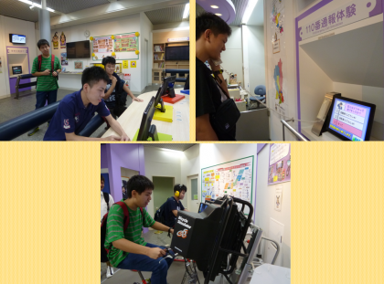 白バイにまたがったり,シミュレーション電話に挑戦したり,固定された自転車に乗ったりしました。