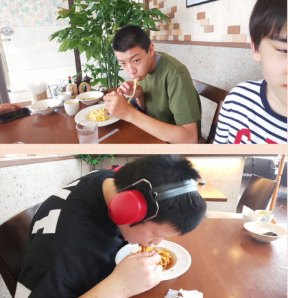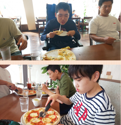 ピザの大きさにびっくり!!パスタも上手に巻いておいしくいただいてます!!